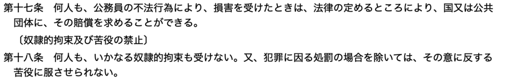 また「なんぴとも公務員から不法行為を受けた場合には」「法律に基づいて」「公務員に損害賠償を求めて良い」とあります